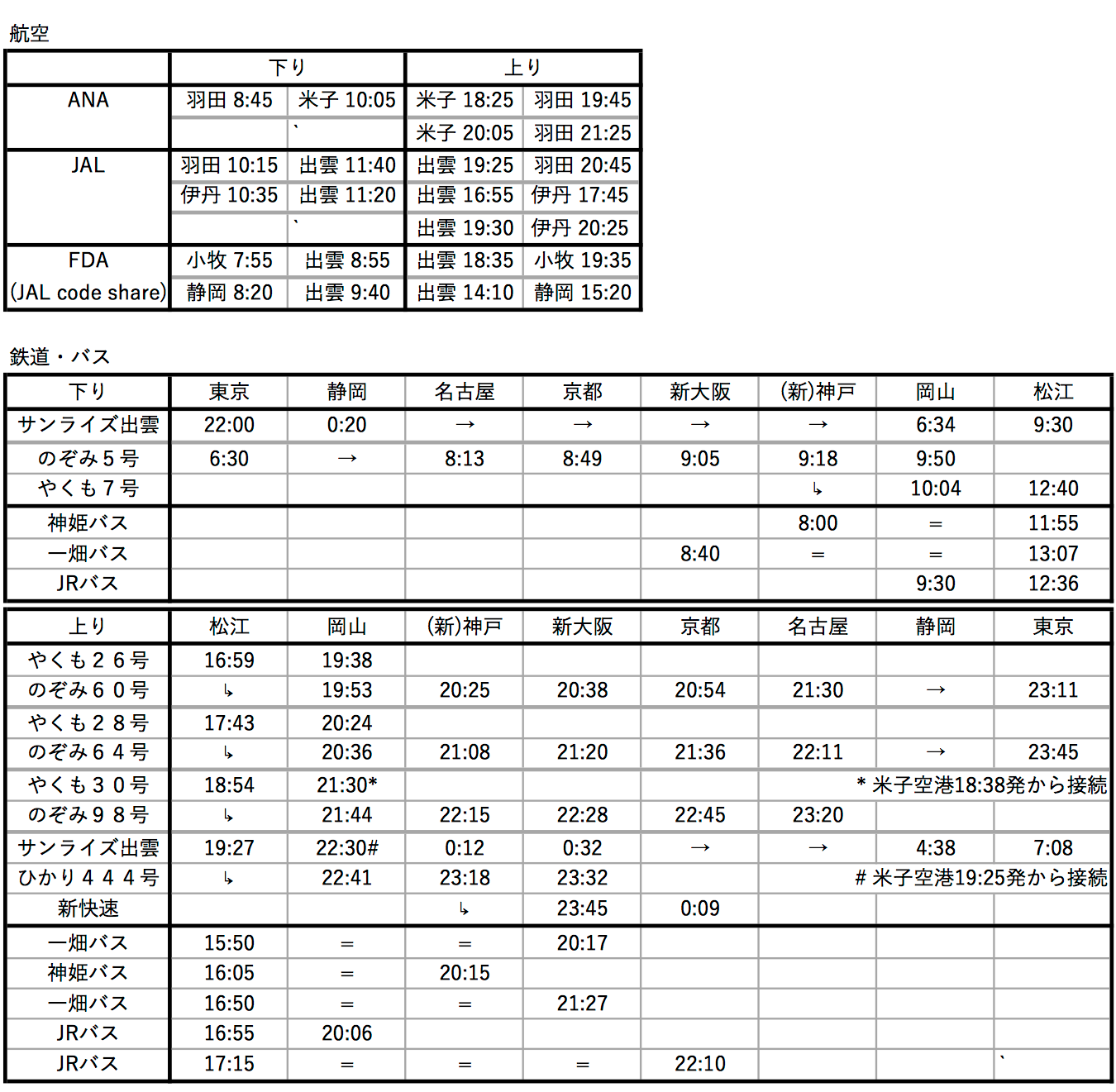 9/9出発・9/12帰着の交通機関 (最新情報は 出雲空港・